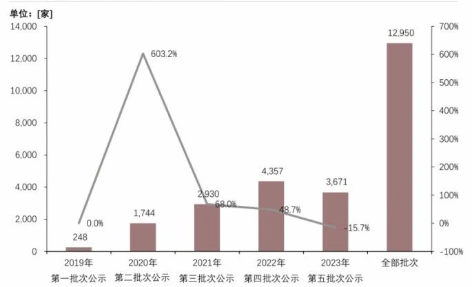 自2019年啟動(dòng)專精特新“小巨人”企業(yè)培育工作以來,企業(yè)數(shù)量呈階段性變化。早期認(rèn)定數(shù)量穩(wěn)步增長,進(jìn)入“十四五”時(shí)期,隨著培育工作上升至國家戰(zhàn)略高度,相關(guān)政策不斷完善,如《“十四五”促進(jìn)中小企業(yè)發(fā)展規(guī)劃》明確培育目標(biāo),《優(yōu)質(zhì)中小企業(yè)梯度培育管理暫行辦法》細(xì)化評(píng)定標(biāo)準(zhǔn),地方政府也紛紛出臺(tái)配套政策,推動(dòng)2021—2022年企業(yè)認(rèn)定數(shù)量快速攀升。但現(xiàn)階段認(rèn)定速度有所放緩,第五批次認(rèn)定數(shù)量相比第四批次有所減少。