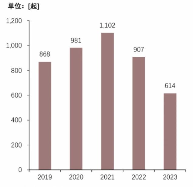 在政策引導(dǎo)下,“專精特新”領(lǐng)域吸引大量投資,投融資活躍度較高。截至2023年,4233家專精特新“小巨人”企業(yè)獲得戰(zhàn)略融資,309家企業(yè)獲得A輪融資。但仍有8536家企業(yè)未獲得融資,融資滲透率僅50%。從融資時(shí)間分布來看,2019—2021年融資事件逐漸增多,2021年達(dá)到1102次,之后熱度有所下降,2023年發(fā)生融資614次。未來提升融資滲透率,實(shí)現(xiàn)知識(shí)產(chǎn)權(quán)投融資全覆蓋是發(fā)展重點(diǎn)。