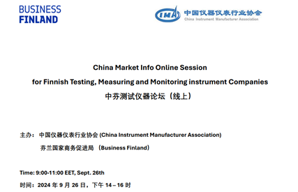 2024926日,由中國儀器儀表行業協會(CIMA)和芬蘭國家商務促進局(Business Finland)聯合主辦的中芬測試儀器論壇(線上)成功舉行。本次論壇旨在促進中、芬兩國在測試、測量和監測儀器領域的交流與合作,吸引了中、芬多家企業代表的參與。