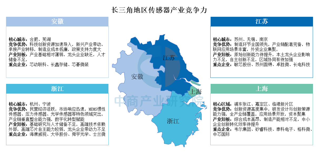 長三角地區傳感器產業呈現多層級協同發展格局:上海以研發創新和資本集聚見長,但面臨制造成本高企的挑戰;浙江憑借民營經濟活力和細分領域優勢快速響應市場,但基礎研究能力薄弱;江蘇強于制造配套和物聯網應用,卻缺乏本土龍頭企業引領;安徽依托政策紅利和成本優勢加速產業承接,但產業基礎與人才儲備尚待夯實。