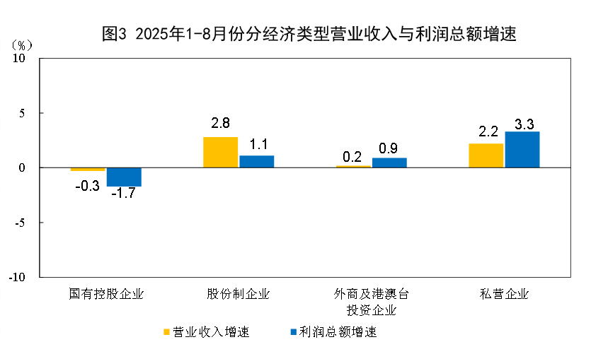 1—8月份,規(guī)模以上工業(yè)企業(yè)中,國有控股企業(yè)實現(xiàn)利潤總額15156.5億元,同比下降1.7%;股份制企業(yè)實現(xiàn)利潤總額34931.9億元,增長1.1%;外商及港澳臺投資企業(yè)實現(xiàn)利潤總額11723.6億元,增長0.9%;私營企業(yè)實現(xiàn)利潤總額13076.1億元,增長3.3%。