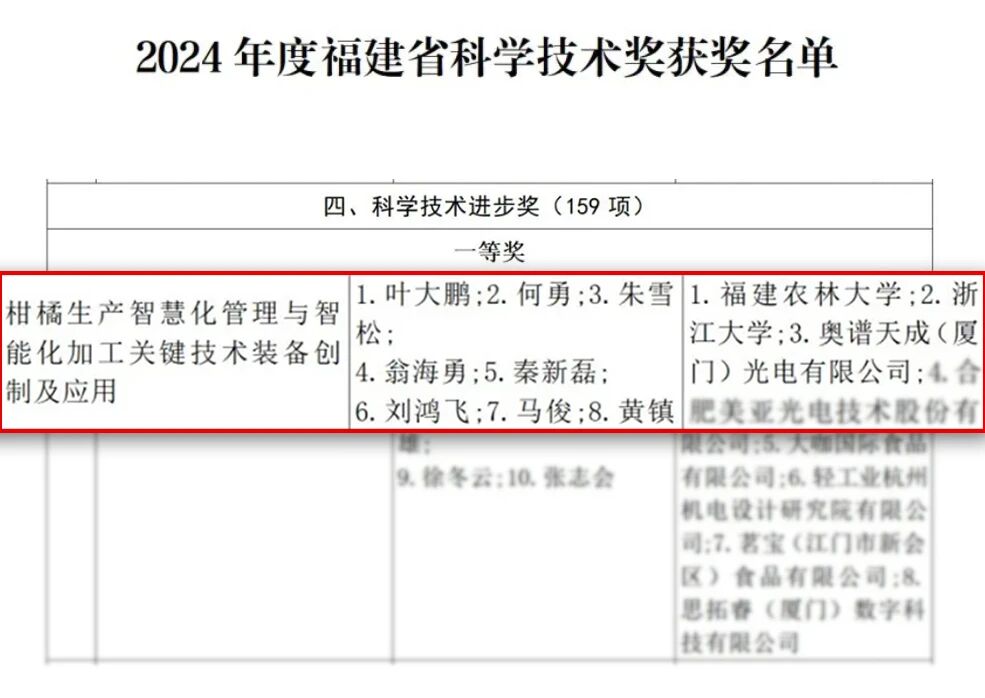 近日,奧譜天成憑借《基于高光譜多譜融合技術(shù)的柑橘生長全周期與品質(zhì)檢測系統(tǒng)》榮獲福建省科技進步一等獎。該獎項由福建省人民政府設立,是省內(nèi)最高級別的科技榮譽之一,重點表彰在技術(shù)創(chuàng)新、工程應用及行業(yè)貢獻方面取得突出成果的單位。本次獲獎不僅體現(xiàn)了該項目在關(guān)鍵技術(shù)上的創(chuàng)新突破,也標志著奧譜天成在農(nóng)業(yè)智能檢測裝備領(lǐng)域的領(lǐng)先實力得到權(quán)威認可。