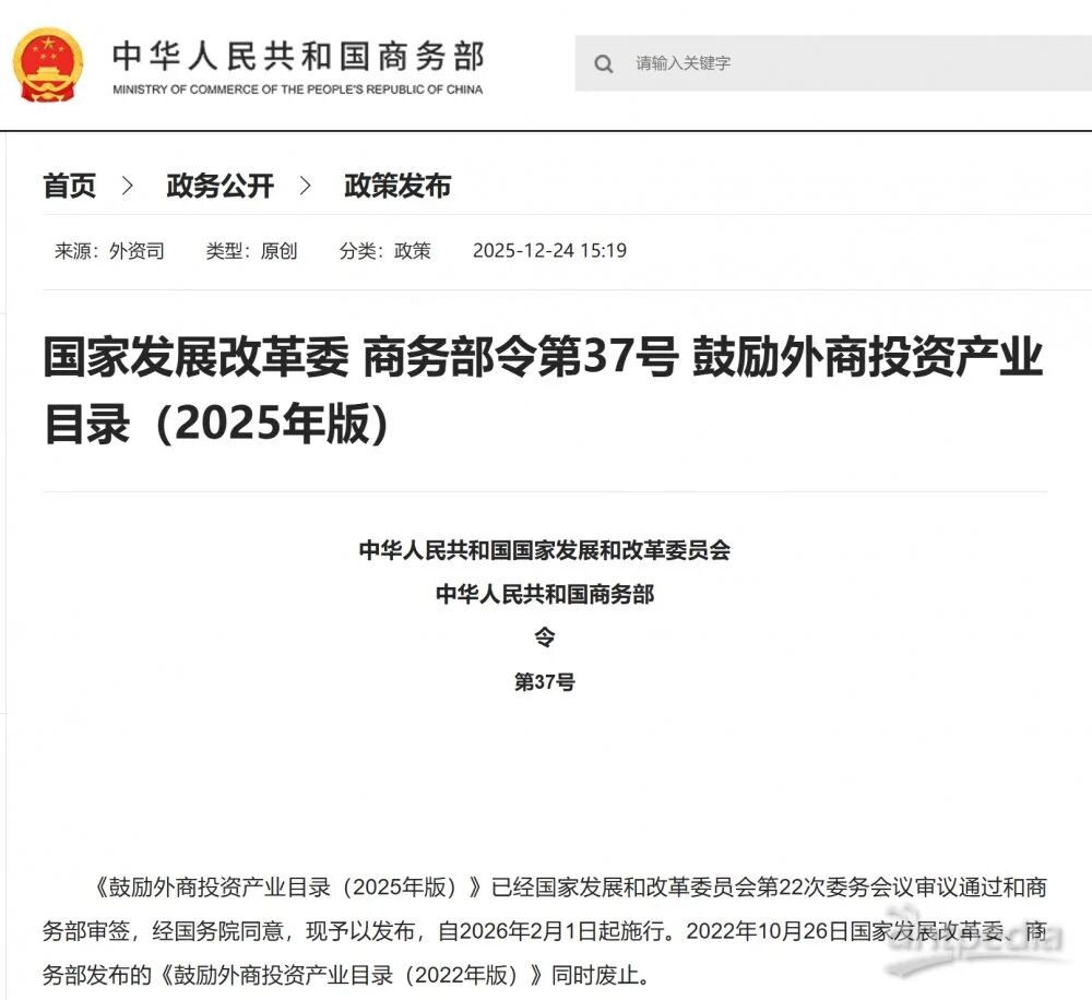 近日,經國務院同意,國家發展改革委、商務部全文發布《鼓勵外商投資產業目錄(2025年版)》(以下簡稱《鼓勵目錄》),自2026年2月1日起施行。