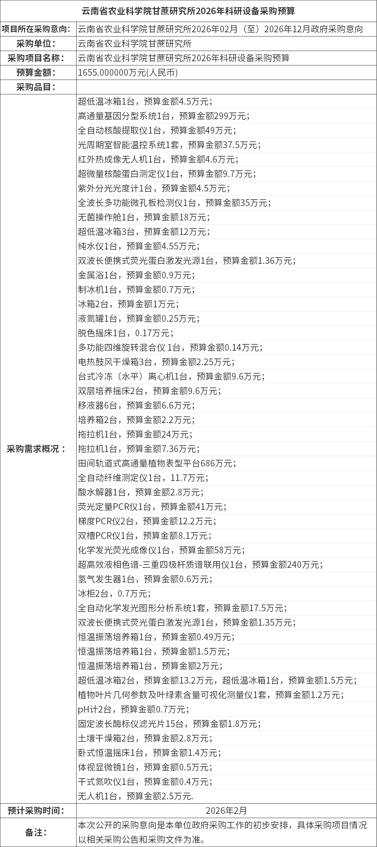 云南省農(nóng)業(yè)科學院甘蔗研究所2026年年科研設(shè)備采購預(yù)算情況發(fā)布,采購51臺套儀器設(shè)備,預(yù)算金額1655萬元。