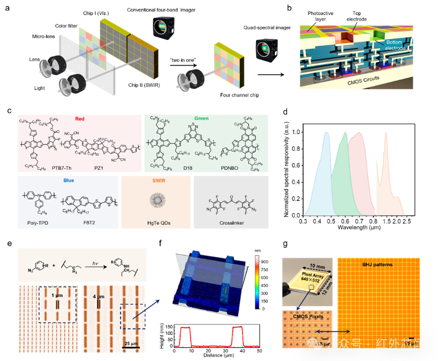 圖1聚焦多通道圖像傳感器的核心設(shè)計(jì)與制備基礎(chǔ),系統(tǒng)呈現(xiàn)集成架構(gòu)、材料選型、圖案化機(jī)理及CMOS兼容特性。對(duì)比采用可見(jiàn)光圖像傳感器+短波紅外圖像傳感器的分離架構(gòu),這項(xiàng)研究聚焦單一集成芯片設(shè)計(jì),將可見(jiàn)光像素與短波紅外像素集成于單芯片,解決了復(fù)雜分光光路設(shè)計(jì)難題,且通過(guò)直接光刻圖案化工藝,實(shí)現(xiàn)多波段探測(cè)像素單片集成,解決了可見(jiàn)光與短波紅外像素CMOS工藝的兼容性難題。利用圖案化技術(shù),本體異質(zhì)結(jié)(BHJ)及膠體量子點(diǎn)像素可以與讀出電路(ROIC)單片集成,具有640×512像素陣列,像素間距為15 μm。