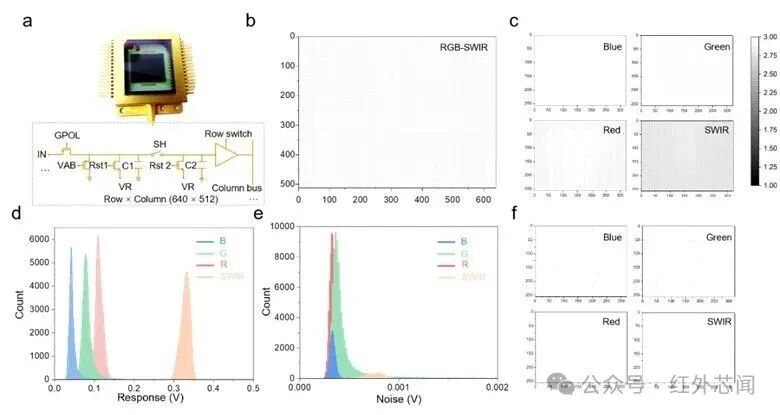 所提出的直接光圖案化方法與標(biāo)準(zhǔn)CMOS制造工藝完全兼容。研究人員將基于聚合物的三色可見(jiàn)光像素與基于碲化汞量子點(diǎn)的短波紅外像素單片集成到同一讀出電路上。這種混合集成策略使得四通道成像器件得以實(shí)現(xiàn),其中可見(jiàn)光和短波紅外像素以2×2陣列排列,每個(gè)子陣列的有效分辨率為320×256。