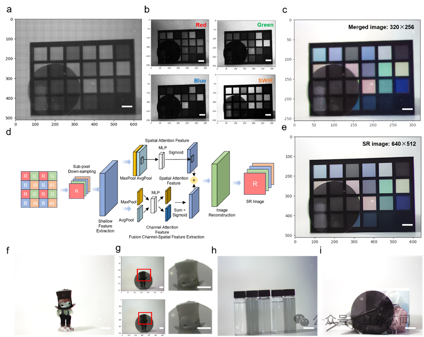 多通道像素架構(gòu)通過(guò)平面空間劃分實(shí)現(xiàn)了多通道(RGB-SWIR)探測(cè),但同時(shí)也將每個(gè)波段通道的物理分辨率降低至320×256像素。為了克服這一分辨率限制,作者提出了一種用于四通道光譜成像芯片的超分辨率重建方法,構(gòu)建了一個(gè)融合“通道-空間”注意力機(jī)制的特征增強(qiáng)網(wǎng)絡(luò)。為分辨率降低提供了補(bǔ)償策略,為平面集成式多通道圖像傳感器建立了一種高分辨成像新范式,超越光譜通道數(shù)量與空間分辨率之間的競(jìng)爭(zhēng)關(guān)系。