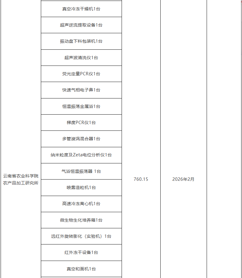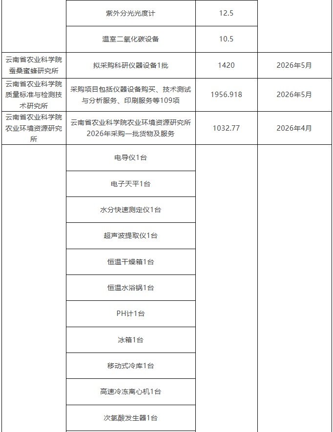 近期,云南省農業科學院多家院屬單位發布2026年儀器設備采購意向,計劃采購全自動智能固相萃取儀、自動核酸提取儀、熒光顯微鏡、近紅外分析儀、組織細胞破碎儀、紫外分光光度計、高速冷凍離心機、真空冷凍干燥機等儀器設備,預算總金額8921.238萬元。預計采購時間2026年2月~11月。